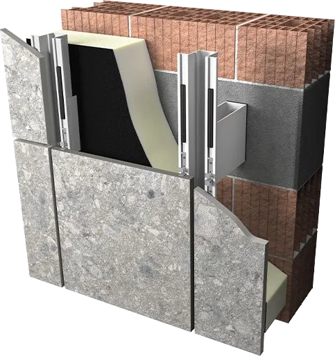Acest sistem consta dintr-o structură metalică solidă, strat de termoizolare din vata minerala, membrana permeabila și placi ceramice